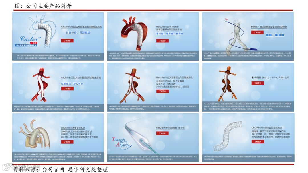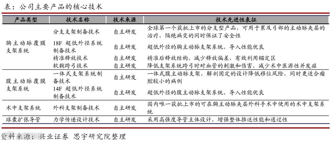 目前,公司主要有9款核心产品,分为主动脉介入类和外周血管介入类。公司核心产品的技术均为自主研发,多个产品实现中国第一甚至全球第一。