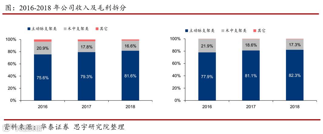 公司主动脉支架类产品贡献了主要收入及毛利,其2018年收入和毛利占比分别为81.6%和82.3%。