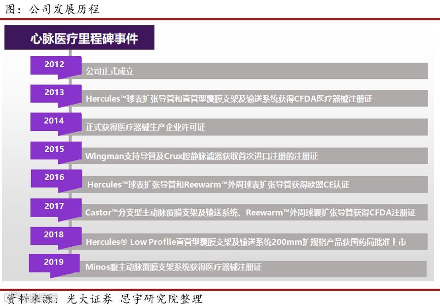 上海微创心脉医疗科技股份有限公司(简称:心脉医疗)是微创医疗科学有限公司旗下的子公司之一,成立于2012年,公司致力于主动脉及外周血管介入医疗器械的研发、制造和销售,主营产品包括主动脉覆膜支架系统、术中支架系统、外周血管支架系统、外周血管球囊扩张导管等产品。