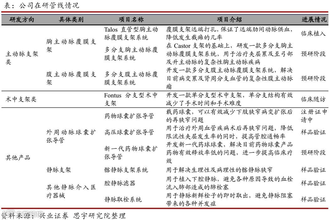 公司在研产品管线主要聚焦主动脉介入领域和外周血管介入领域,主要在研产品有Talos直管型胸主动脉覆膜支架系统、多分支胸主动脉覆膜支架系统、多分支腹主动脉覆膜支架系统、Fontus分支型术中支架、药物球囊扩张导管、高压球囊扩张导管及新一代药物球囊扩张导管、髂静脉支架系统、腔静脉滤器和静脉取栓系统。