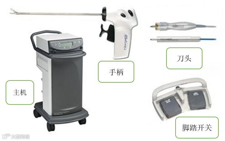 超声刀系统由主机、手柄、器械(刀头)、脚踏开关组成。临床使用时,手术医生既可以手控操作,也可以直接脚踏控制切割、凝血。