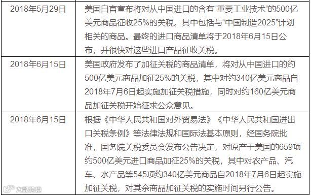 6月15日,白宫对中美贸易发表声明,对1102种产品总额500亿美元商品征收25%关税,正式开启中美贸易战序幕。当天,中国国务院关税税则委员会决定对原产于美国的659项约500亿美元进口商品加征25%的关税,其中对农产品、汽车、水产品等545项约340亿美元自2018年7月6日起实施加征关税,对化工品、医疗设备、能源产品等114项其余商品加征关税的实施时间另行公布。