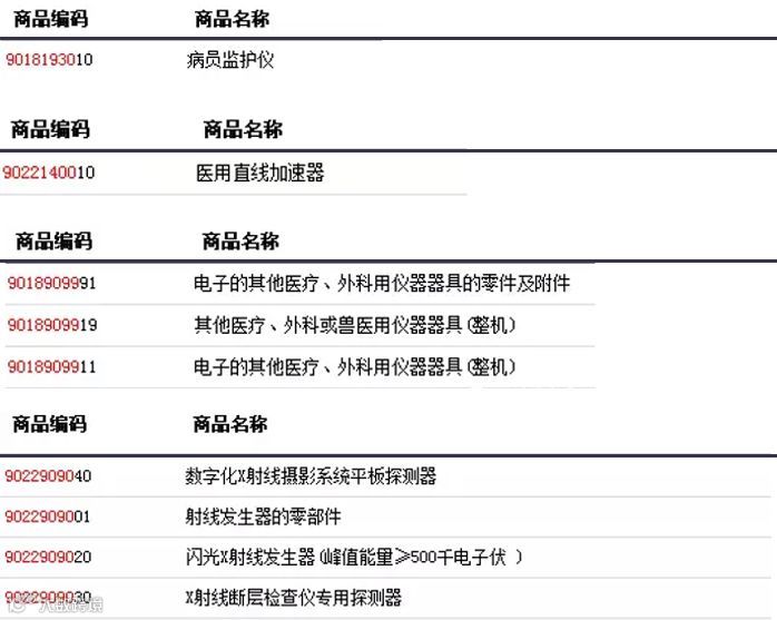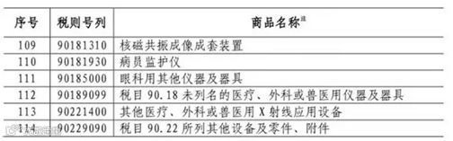 在此次贸易战的中美交锋中,中国立即对美国6月15日公布的具体加征清单做出了回击。国务院关税税则委员会发布公告决定,对原产于美国的659项约500亿美元进口商品加征25%的关税,其中对农产品、汽车、水产品等545项约340亿美元商品自2018年7月6日起实施加征关税,对其余商品加征关税的实施时间另行公告。其中对医疗设备的征税商品范围已经公布,如下: