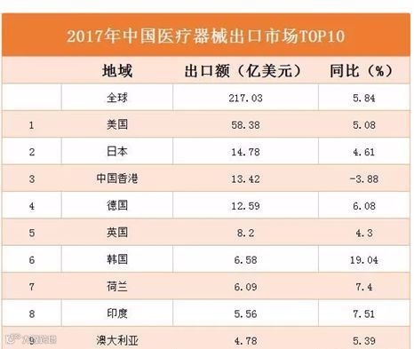 据中国海关统计数据,2017年,我国医疗器械出口总额达到217.03亿美元,同比上涨5.84%,创历史新高。其中,对美国出口额为58.38亿美元,同比增长5.84%。美国成为中国医疗器械第一出口大国,其同盟国日本则为第二大出口对象。