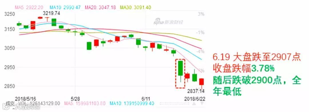 6月15日当天中国沪A股市最高下跌超过1%,开始3000点保卫战。随后经历端午三天假期的休市,上证指数在6月19日开盘后最低跌破2900点到2871点,随后几天股市也都未见涨势并跌破2900点,处于全年最低股指水平。创业板指数也再创新低1521点,1500点已岌岌可危。最新6月28日上证指数已经跌破2800点,到2786.90,处于全年最低股指水平。