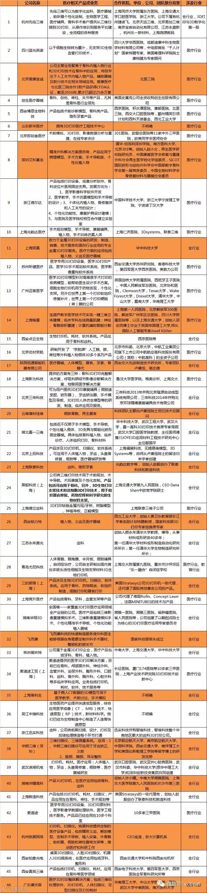 在做这个选题之前,本以为国内的相关企业会很少,可是此次盘点动脉网一共找到46家与3D医疗打印相关的企业(由于时间和信息量的关系,相信我们收集的数据并不全面,未收录到的企业和机构请与我们联系)。