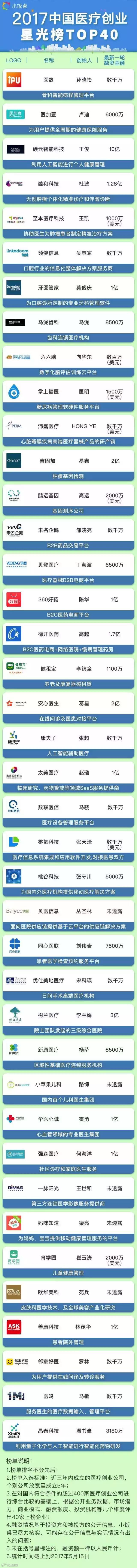 我们对近几年成立的超过400家医疗健康创业公司进行了研究和数据调研,综合商业模式、业务数据、技术创新、未来成长空间等多维度,从中评选出了2017中国医疗创业星光榜TOP40。