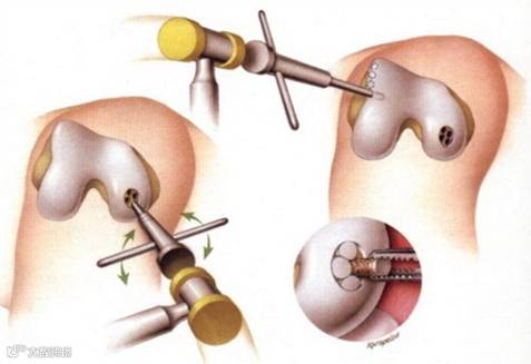 软骨下骨钻技术为Pridie最早在1959年提出,其治疗方法是在软骨缺损处制造一个直径大约为2~2.5mm的孔,深度达到软骨下骨层的骨髓层,利用骨髓中释放的干细胞、生长因子等修复软骨。