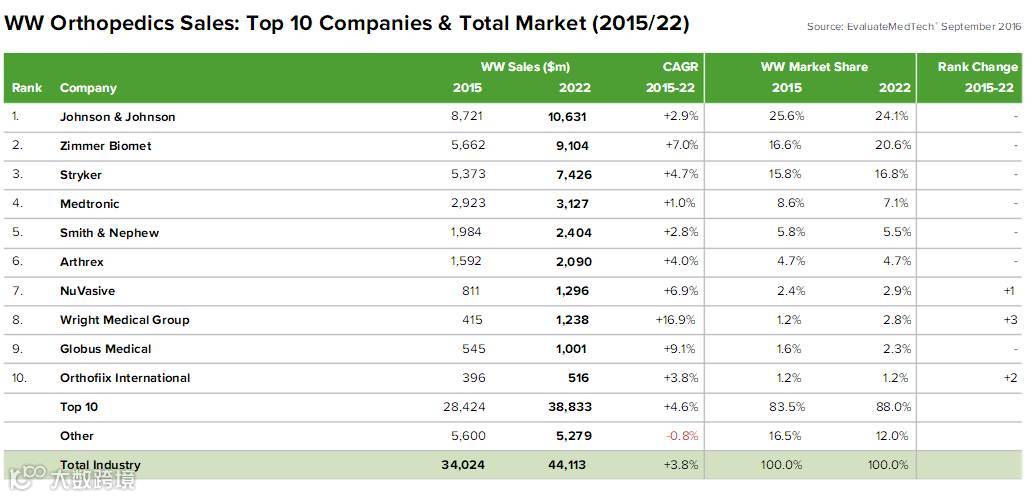 全球骨科市场集中度较高,2013 年top10 的骨科企业销售额占比87.7%,预计2020年top10 销售额占比为85.9%,虽略有下降但依然保持高位。
