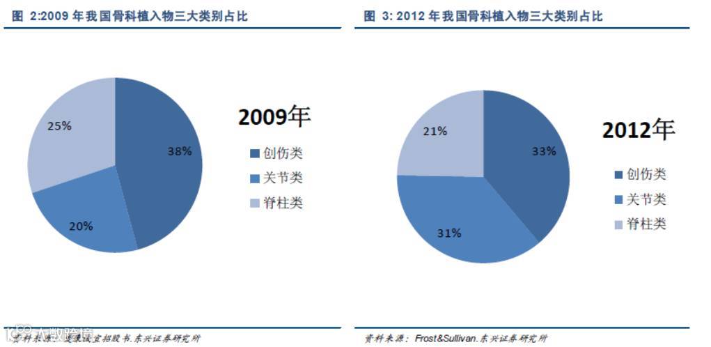 根据Frost&Sullivan 的预测,2012 年中国骨科植入物的市场规模约95.4 亿元,2008-2012 年的复合增速是18.2%,预计到2017 年市场规模将达到218 亿元。在骨科植入物三大门类中,创伤类规模最大,关节和脊柱增速最快。根据中国医疗器械行业协会统计,2009 年我国创伤、关节和脊柱规模占比分别为38%、20%和25%。根据Frost&Sullivan 统计,2012 年创伤、关节和脊柱占比大致为33%、31%和21%。现阶段我国骨科植入物中创伤占比大于关节和脊柱,但关节和脊柱的总量和占比提升是大势所趋。