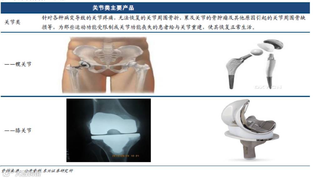 关节通常由纤维结缔组织、软骨和韧带组成。适应症是关节类病如关节炎、骨质增生和风湿、骨肿瘤和关节周围骨缺损等,尤其以老年人和运动过度损伤居多,在保守治疗无效后,多数会采取关节置换或重建。关节类需要长期植入在身体中,因此产品要求尽可能模拟人体生理关节运动状态和功能,对稳定性和植入材料性能均有较高要求。关节类产品中髋关节和膝关节占比超过一半以上。