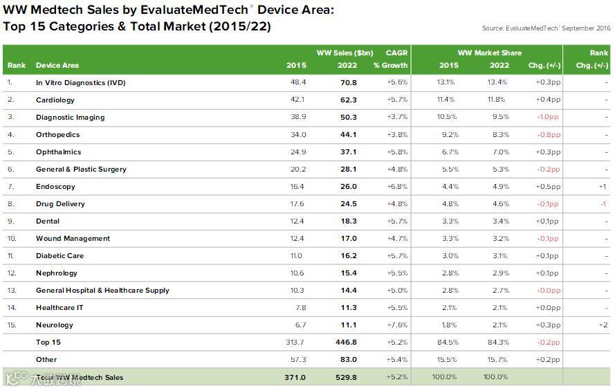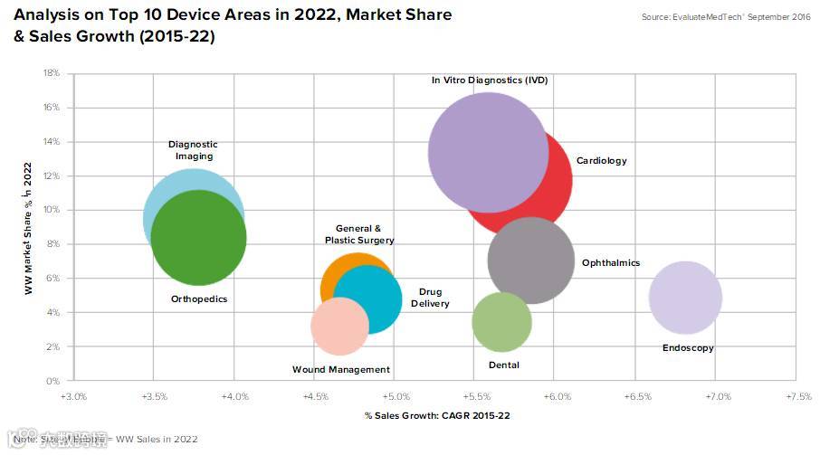 据Evaluate Med Tech统计,在器械的市场份额上,骨科紧随体外诊断、心血管、医学影像,排名第四;而从单个病种而言,实际上骨科仅次于心血管。2015年骨科全球销售额达到340亿美元,预计到2022年将达到441亿美元,年复合增长率3.8%。世界范围总体增长已趋平缓。