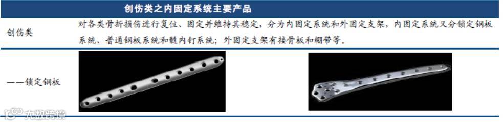 创伤类主要是交通事故和摔倒跌落等意外所造成的各种骨折损伤复位、固定和功能锻炼。创伤产品主要分为内固定系统和外固定支架,内固定系统又分锁定钢板系统、普通钢板系统和髓内钉系统;外固定支架有接骨板和绷带等。在使用中以内固定系统为主,占比95%左右,并以其中的钢板类使用量增长最快。