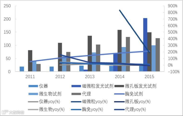 在增速上,化学发光检测表现出稳健的增长势头,从2010-2015这5年间,均保持10%左右的增速。其增速来源有两个:第一是免疫检测方法的替代,以前采用手工检测的ELISA等免疫检测方法逐步被化学发光检测方法所代替;第二是样本量的增长,越来越多的项目检测被纳入化学发光检测中。