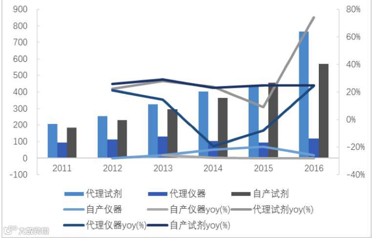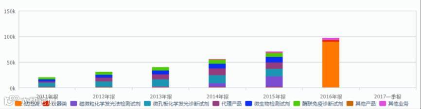 安图生物业绩成长迅速,2012-2016年增速均保持25%以上,营收为32.5%。2016年实现营业总收入9.8亿元,同比增长36.87%。其中,磁微粒化学发光试剂从2013年起产生收入,2015年收入达2亿元,增速大于100%。