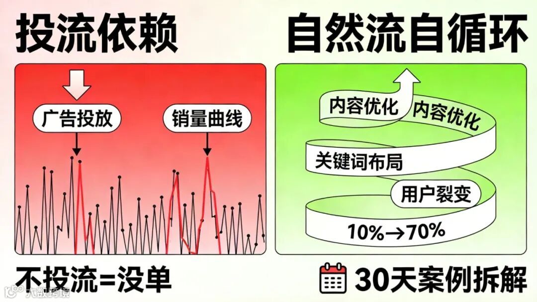 你是否陷入了“不投流就没单”的困境? 广告一停,销量立刻下滑。健康的TikTok店铺,最终目标是让自然流量成为出单的“主动轮”。今天拆解一个真实店铺案例,看他们如何用一个月时间,将自然流订单占比从10%提升到70%,实现广告越投越少、单却越出越多的“自循环”。