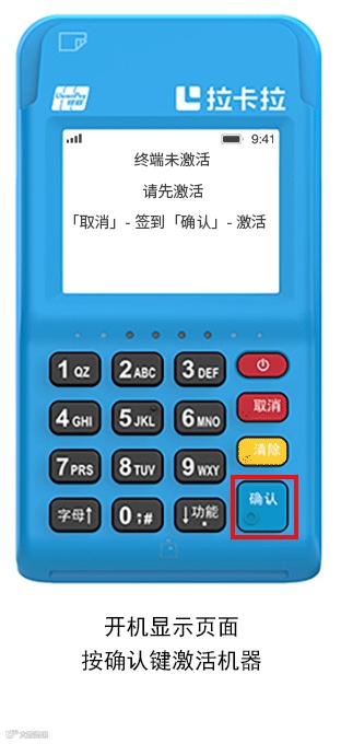 商户在机具上输入收到的激 活码(12位),激活机具绑定商户并签到后,可正常收款。