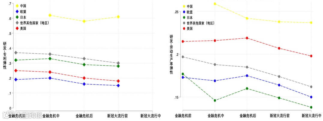 图1 主要国家(地区)记分牌企业研发对专利的弹性和研发对劳动生产率的弹性