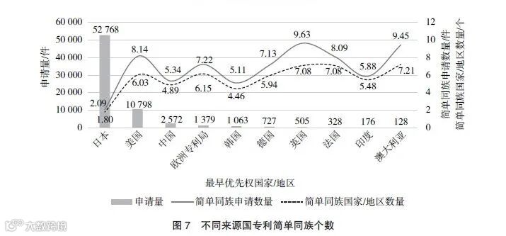 从国际角度来看,AI技术的发展和专利申请在全球范围内加速。图7展示了不同来源国专利简单同族个数,反映了国际专利布局的广泛性和战略性。当美国、中国、欧洲专利局(EPO)、韩国、德国、英国、法国、印度和澳大利亚作为最早优先权国家/地区时,相关申请会进行广泛的专利布局,简单同族国家/地区数量会超过4个;相反的是,当日本作为最早优先权国家时,其简单同族国家/地区数量的数量却不超过2个。可见,来源于日本本国的申请通常在本土寻求保护,仅在有需要的2~3个国家/地区寻求保护。