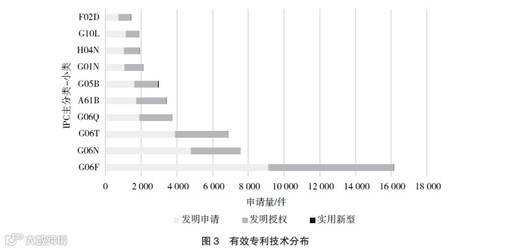 图3展示了有效专利技术分布,G06F、G06N、G06T、G06Q、A61B、G05B是最主要的IPC主分类-小类,这些IPC主分类-小类主要与电数字数据处理,基于特定计算模型的计算机系统,一般的图像数据处理或产生,专门适用于行政、商业、金融、管理或监督的信息和通信技术,诊断、外科和鉴定,大模型处理的文本、图像、视频数据等息息相关,也与AI所应用的智能制造、智能家居、智能客服、智能交通、智能安防、智能医疗、智能物流、智能教育和智能司法等领域相关。特别是G06N分类下的专利申请,涉及有关AI的各种算法,其中机器学习(尤其是深度学习)发挥了主导作用。