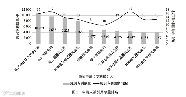 专利申请或专利的被引用数量在一定程度上反映发明或实用新型的独创性和影响力。统计每个维度施引专利数的总和作为施引专利数量。如图5和图6所示,根据申请人被引用总量排名和不同技术被引用分析可以看出,专利申请或专利的独创性和影响力。排名前9位的主要申请人同时也是高频被引用的申请人,且施引专利国家/地区数量普遍在10个以上,可见,主要申请人的专利申请不仅在申请量上占据优势,同时被引用数量也能够显示其技术的影响力和认可度。值得注意的是,索尼集团公司虽然在专利申请总量、授权专利总量未进入前10名,但是在施引专利数量上位列第六,可见其申请量虽少但质量较高,在相关技术领域具有强劲的竞争力。