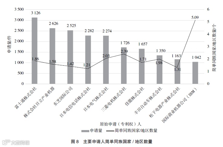 图8展示了主要申请人简单同族国家/地区数量,排名前10位的主要申请人也是简单同族国家/地区数量排名前10位的申请人,可见这些主要申请人都有在海外进行广泛专利布局的意识。并且,作为外国申请人的国际商业机器公司在简单同族国家/地区数量这个指标上位居首位,展现了其专利申请少而精、海外广泛布局的策略。