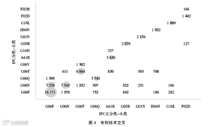 AI的应用领域非常广泛,涵盖了多个行业和方面。图4展示了专利技术交叉的情况,AI技术因其跨学科的特性,在多个领域如图像处理、医疗诊断、自然语言处理等中都有广泛应用,导致相关专利申请在不同技术分支之间产生交叉。G06F和G06N是较易与其他IPC主分类-小类存在交叉的类别,IPC主分类-小类G06F常与G06N、G06Q存在交叉,IPC主分类-小类G06N常与G06F、G06T存在交叉,IPC主分类-小类G06T常与G06N、G06V存在交叉,IPC主分类-小类G06Q常与G06F、G06N存在交叉。特别是IPC主分类-小类G06N,作为与AI基础算法相关的类别,在专利技术交叉中占据了重要地位。
