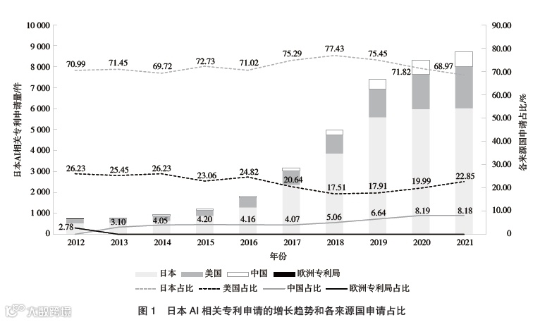 图1展示了日本AI相关专利申请的增长趋势和各来源国申请占比。自2016年起,专利申请量显著上升,2019—2021年年均申请量超过8000件,显示出持续增长的趋势。日本本国的申请量占据主导地位,占比基本稳定在70%左右。美国和中国的申请量分别位列第二和第三,占比分别保持在17%~27%和10%以内,反映了日本在AI领域的自主创新性和国际合作的广泛性。