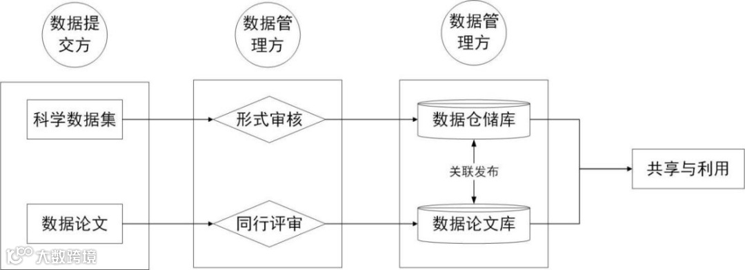 在数据汇交过程中,数据提交方仅需提交数据论文和数据集,其中数据论文提交至数据论文平台,数据集提交至数据仓储库。随后,数据管理方将分别对数据论文和数据集进行审核。审核完成后,数据论文和数据集将分别在数据论文平台和数据仓储库中发布。此外,数据论文平台与数据仓储库之间建立了关联,实现两者之间的互相访问。