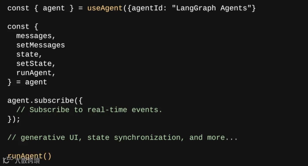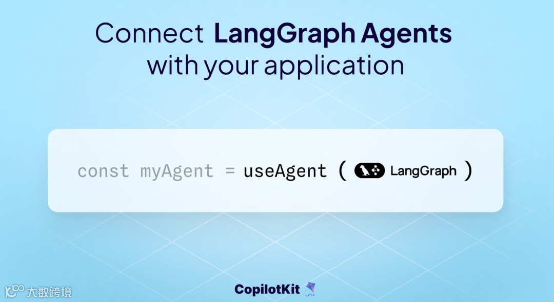 现在介绍 useAgent —— 一个简单的 React hook,能让你的 frontend 直接连接到 LangGraph agent。无需连线。无需样板代码。无痛集成。