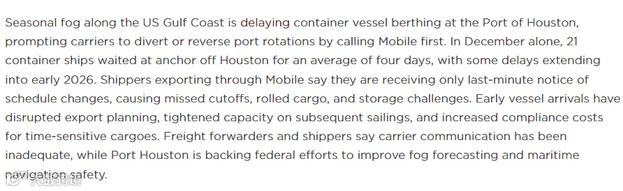 截至1月15日,休斯顿港区域的大雾天气已逐步好转,航道能见度恢复至安全通行标准,但前期积压的大量船舶仍未完全疏导完毕。业内预计,该港口要彻底恢复常态化运营节奏,还需3至5天的时间,期间贸易端的连锁影响仍将持续。