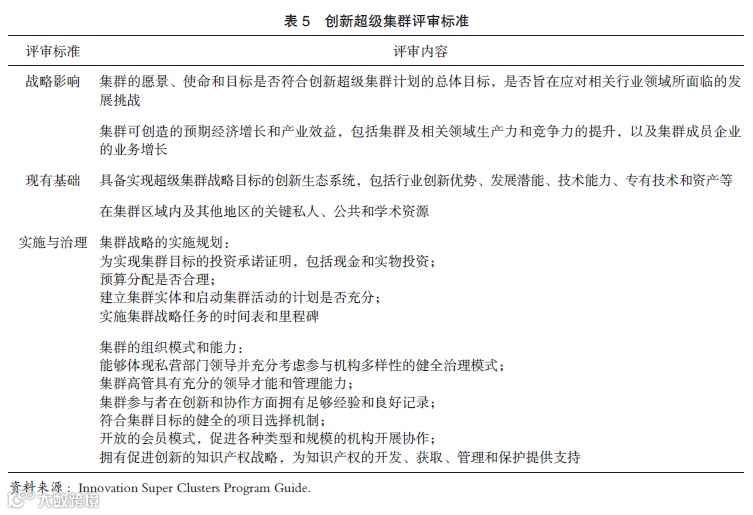 二是提案要求明确具体,确保超级集群战略目标清晰。超级集群战略应基于候选集群区域现有的独特资源禀赋和产业优势、创新生态系统缺陷以及相关领域的行业现状和主要挑战,围绕以下五大战略任务构建,包括:(1)提升技术领先性:(2)促进合作和企业发展(为中小企业提供战略合作伙伴对接、业务咨询、融资渠道等);(3)构建多元化专业人才基础(吸引海外人才、专业认证、劳动力再培训);(4)加大创新资源应用(专业技术服务推广、专利权收购与共享);(5)打造全球优势(集群推广、招商引资、国际市场研究、国际标准制定等)。提案必须建立在私营部门伙伴共同承诺的基础上,包括对ISI计划资金提供匹配投资、参与集群管理以及在集群活动中发挥领导作用(例如牵头项目、借调技术人员)等,旨在推动集群成员开展战略合作,实现集体利益最大化。