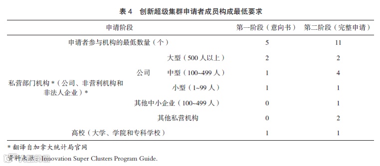一是申请主体必须是企业主导的联盟,确保超级集群围绕产业需求推动产学研合作。联盟须由企业牵头,并确保各类创新伙伴的参与,联邦和地方(省、市)政府以及个人不具备申请资格。每个阶段对大公司、中小企业和大专院校及其他机构的数量都有最低要求,其中至少包括一所大专院校,但其不能主导申请,也不要求承诺提供配套资金,具体要求见表4。