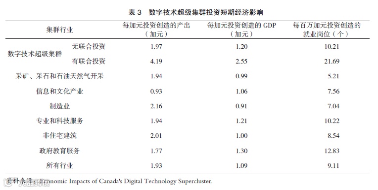 在宏观层面,超级集群投资的短期经济影响已经显现。以数字超级集群为例,其主要经济指标(每加元投资创造的总产出、GD和就业岗位)都实现了翻番,投资效益远高于主要行业平均水平,详见表3。