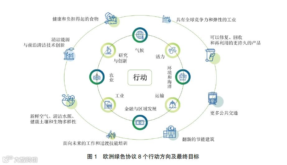2011年3月,《欧盟2050低碳经济路线图》提出推动欧盟2050年实现在1990年基础上减排80%~95%的长远目标;12月的《2050年能源路线图》提出了该目标的具体路径。2019年12月,《欧洲绿色协议》覆盖欧盟的全部经济领域,旨在实现欧盟经济的可持续化发展转型。该协议针对欧洲绿色发展的总体战略框架进行了描述,并提出相应的关键政策和落实措施的初步路线图,将通过8个方面的行动改善公民及后代的福祉和健康,如图1所示。2020年9月,《2030年气候目标计划》提出在2030年进一步将温室气体净排放量至少比1990年减少55%,并最终在2050年实现“气候中和”;12月的《欧洲气候公约》确保公民和社会各界都能参与应对气候变化的行动。2021年6月,《欧洲气候法案》将2050年“气候中和”目标纳入欧盟法律。欧盟通过一系列的政策整合,建立不断完善、健全的低碳法律法规体系。