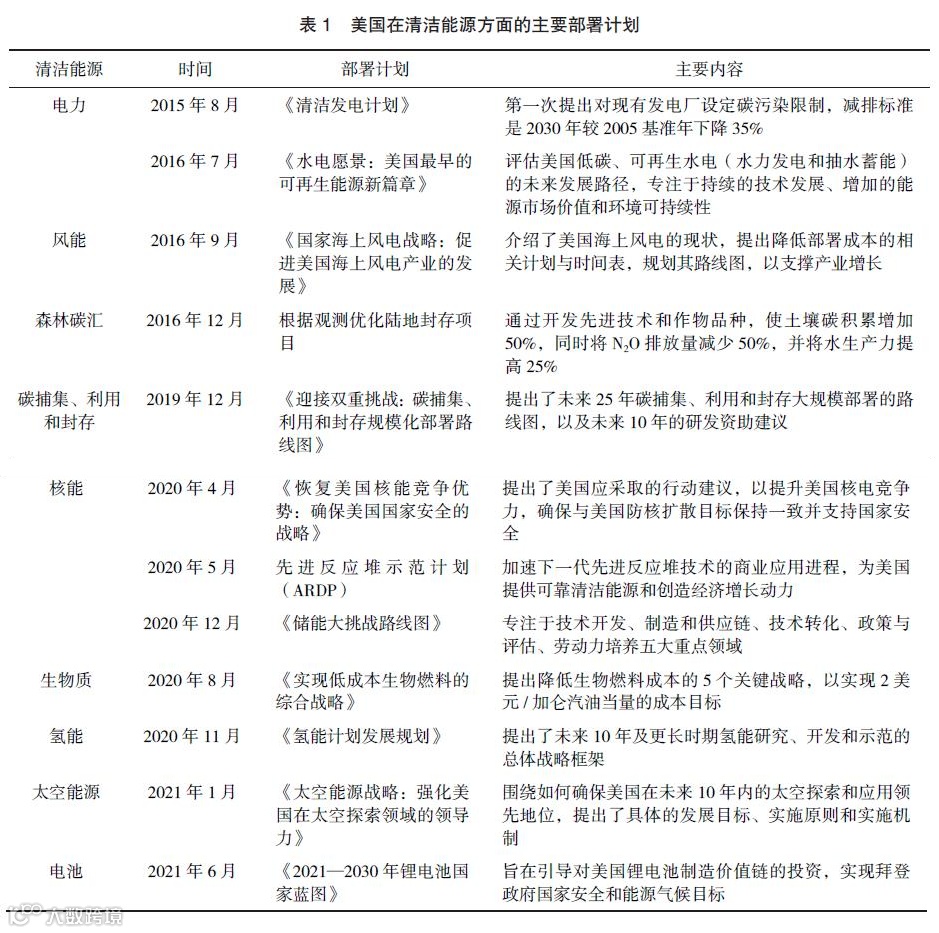 美国的能源消费结构从1949年以来不断优化,煤炭作为美国第一大能源,分别被石油(1950年)、天然气(1958年)、可再生能源(2019年)陆续超越,在2020年的发电用能中只占19%。2014年5月,《综合能源战略是实现可持续经济增长之路》将低碳技术、清洁能源的未来发展作为能源战略支点,特别强调美国要在可再生能源技术上取得领先。2020年10月,《关键技术和新兴技术国家战略》将能源技术确定为20个重点技术领域之一。2021年4月,《综合能源系统(HES):协同研究机遇》指出,综合能源系统通过总体控制或物理方式集成多种能源生产、存储和/或转换技术,以实现节约成本、增强能效和环境效益。美国政府对生态环境的苛刻要求,也刺激了能源产业的技术升级,进而推动美国的持续减排。2020年11月12日,美国能源部发布《氢能计划发展规划》,提出了未来10年及更长时期氢能研究、开发和示范的总体战略框架。美国政府一系列的能源战略涉及清洁能源的多个领域,主要的规划部署如表1所示。2021年5月,白宫公布《2022财年联邦全面预算方案》,将向美国能源部拨款462亿美元,旨在通过推进清洁能源创新、部署清洁能源项目、科学应对气候危机等,解决能源、环境和核安全挑战,保障美国能源安全和经济的持续增长。