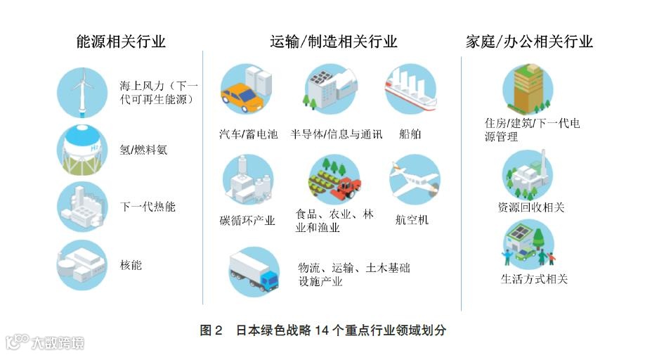 日本希望通过各个产业部门实现电气化,达到碳中和目标。2008年制定、2013年9月修正的《环境能源技术革新计划》提出提高火力发电效率、开发新一代太阳能发电技术、地热发电等。2009年4月,《未来开拓战略》提出低碳技术创新相关政策目标,涉及低碳能源、环保车、低碳交通和再生资源回收利用等技术领域。2013年6月,《科学技术创新综合战略》提出实现清洁、经济的能源系统,利用革新性技术扩大可再生能源供应。2016年4月,《能源环境技术创新战略2050》提出,到2050年全球温室气体减排和构建新兴能源体系的目标与战略。2018年7月,《第五期能源基本计划》提出,削减能耗、提高零排放电力比例、降低二氧化碳排放量、降低电力成本、提升能源自给率。2020年12月制定并于2021年6月修订的《2050年碳中和绿色增长战略》,为促进日本经济的持续复苏,明确了海上风电、氢/燃料氨、碳循环产业等14项产业的战略定位及路线图,如图2所示。2021年5月,《全球变暖对策推进法》首次将温室气体减排目标写入法律,以立法的形式明确了日本政府提出的“2050年实现碳中和”的目标。