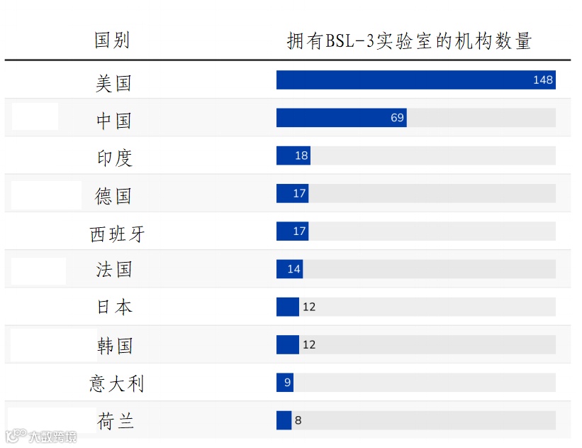 图2 各国拥有BSL-3实验室的机构数量