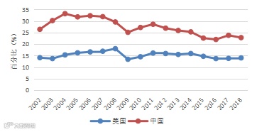 图6 中美KTI出口中外国增加值所占的份额