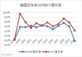 图3 中美两国历年来GDP和KTI的增长率