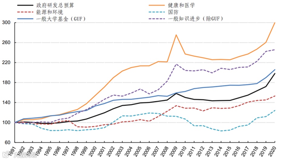 图6 OECD范围内各行业领域政府研发支出变化趋势(以1991年为基准,%)