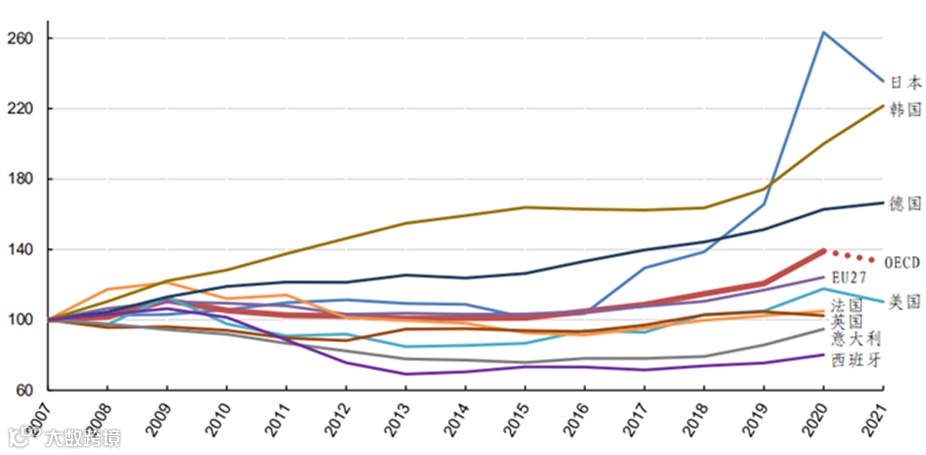 图1 2007—2020年OECD经济体研发支出趋势(以2007年为基准,%)