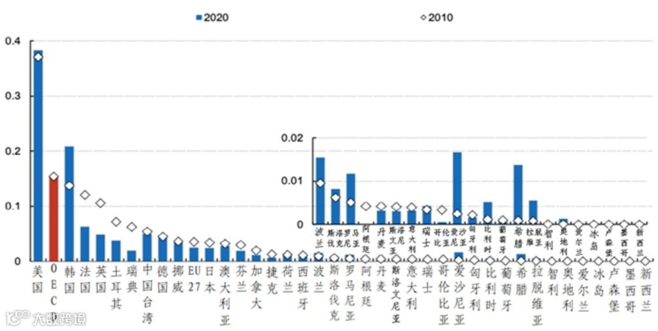 图7 OECD经济体政府2010和2020年度国防研发支出强度(单位:%)