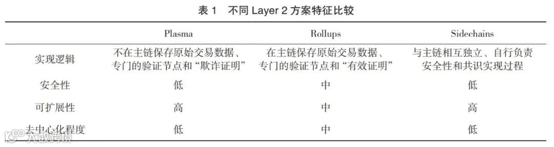 当前Layer 2方案主要有Plasma、Rollups和Sidechains,但由于不同方案之间实现逻辑不同,实践中的安全性、扩展性和去中心化程度也不尽相同(见表1)。