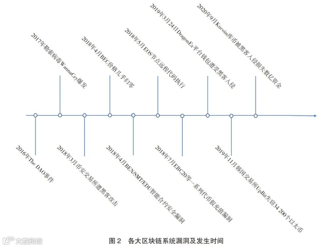 智能合约是区块链技术的核心,是保障各类交易稳定运行的自动化工具,但目前仍有诸多因素影响智能合约的安全性。人为因素方面,智能合约的编写与生成完全依赖程序员,开发人员的编程水平将直接影响合约的功能完整性及条款严密程度,同时,由于无法确保开发人员自身的合规性,合约中可能出现人为主观意识的叠加,导致漏洞被不法分子利用,造成严重损失。此外,当前编程脚本语言成熟度不高,合约中不可避免地会出现整数溢出、函数调用错误等程序错误,此类案例已屡见不鲜(见图2)。The DAO是以太坊著名的项目,在2016年筹集了1.5亿美元,是当时世界上最大规模的众筹,而2016年6月18日,黑客利用The DAO中递归和资产销毁两个漏洞进行了200多次攻击,造成超过360万枚以太币的损失。2018年4月22日,黑客通过整数溢出漏洞攻击了BEC的Token合约,释放了大量Token,致使BEC的价格几乎归零。2018年5月29日EOS节点远程代码执行。2020年9月27日,Kucoin库币被黑客入侵,损失数亿资金。2020年12月21日,英国加密货币交易所EXMO发生重大安全漏洞,导致平台冻结所有提款。此外,智能合约涉及法律有效性的问题,作为自动执行的约定,其并不具备法律效力,在出现问题时尚不能作为法律凭证。此外,长期存在的双花攻击(恶意节点掌握全网50%以上的算力,就可以生成比主链更长的侧链)和DOS攻击(通过填充多余的请求使主机系统或者主机网络资源过载,从而阻止合法服务的实现),也成为区块链技术难以消除的隐患。