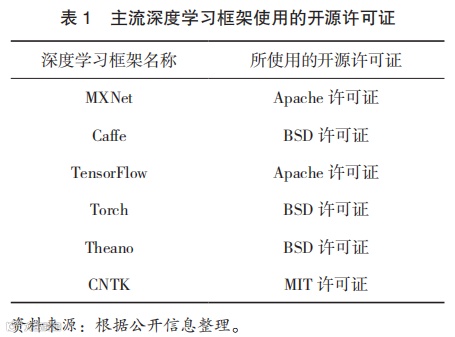 以主流的深度学习框架为例(见表1),目前人工智能开源项目主要使用MIT许可证、BSD许可证、Apache许可证等使用度最高也是最利于开源项目商业化的开源许可证。这些较为成熟的开源许可证为人工智能开源项目的开发和再传播提供了规范的法律环境和良好的商业环境,而这背后则离不开开源基金会、科研院所等机构的智慧。MIT许可证是麻省理工学院制定的,BSD许可证是加州大学伯克利分校针对自研的Unix操作系统而推出的,Apache许可证则是由Apache基金会在MIT许可证和BSD许可证基础上修改发布的。