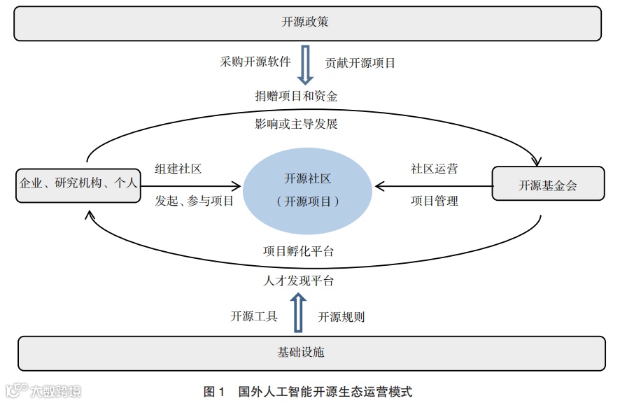 针对人工智能开源这一话题,国内外研究都比较少。国内研究主要以高校、科研院所等发布的研究报告为主。上海交通大学编写的《激活AI创新之源——上海人工智能开源开放发展报告》重点介绍了目前国内外主要的人工智能开源开放平台及项目。国家人工智能标准化总体组的《人工智能开源与标准化研究报告》基于典型的人工智能开源项目分析了各开源技术的特点。中国人工智能开源软件发展联盟重点研究了人工智能开源软件的发展现状和应用案例。综上,现有文献更侧重于从技术层面梳理国内人工智能开源的发展现状,而从体制机制层面研究如何实现我国人工智能开源生态可持续运营的研究较为缺乏。鉴于此,本文尝试从国外人工智能开源实践中总结出实现人工智能开源生态可持续发展的关键要素,为更好地构建我国人工智能开源生态提供参考。