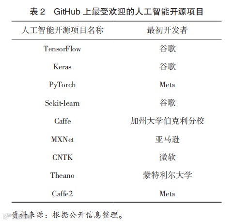在此轮人工智能浪潮兴起之际,开源就成为众多企业的首选。以谷歌、IBM、Meta、微软为代表的国际顶尖科技企业,凭借自身的数据、技术和资本等优势,持续在人工智能开源领域发力,主要通过三种方式参与人工智能开源生态的建设:一是将自行开发的人工智能软件实行开源。2015年以来,美国人工智能研发巨头先后宣布开源自研的人工智能平台、引擎和工具包。Meta开源了一组基于Torch的深度学习工具;谷歌将其开发的深度学习引擎TensorFlow开源,且据谷歌官方统计,截至目前,谷歌已开源了50个人工智能项目;微软开源了分布式机器学习工具包DMTK;IBM将机器学习平台System ML开源。二是通过开源基金会资助人工智能开源项目。IBM、谷歌、微软、Meta、亚马逊等企业均是Apache、Linux、OpenStack三家顶级开源基金会的高级会员,每年都会投入一定数量的资金支持开源基金会开展项目孵化等服务。三是收购或投资开源平台或企业。2018年,微软收购了全球最大的开源代码托管平台GitHub,IBM收购了全球知名开源解决方案提供商红帽,谷歌投资了全球第二大开源代码托管平台GitLab。