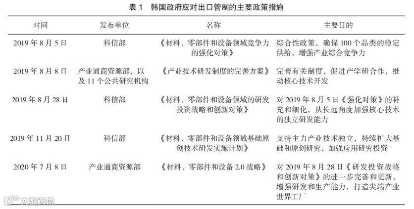 日本宣布对韩出口管制后,韩国相继设立了“材料、零部件和设备技术特别委员会”“全球价值链重组应对特别委员会”等跨部门协调机构,构建国家主导的产学研体系。同时,以科学技术信息通信部(以下简称科信部)、产业通商资源部为代表的主要政府部门,相继出台了多项政策措施,详见表1。