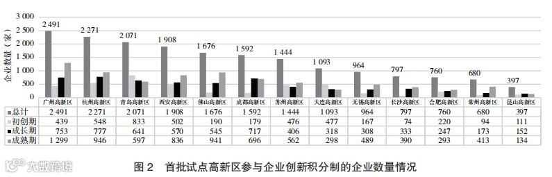 截至2021年底,13家首批试点高新区内共有2.23万家企业主动参与企业创新积分制,其中初创期企业5647家(成立5年以内)、成长期企业7 323家(成立5~10年)、成熟期企业9294家(成立10年以上),初创期企业占比达到25.3%,较好地实现了对早期科技企业的覆盖,起到了对初创企业的价值发现作用,具体企业数量情况见图2。从行业领域看,积分企业主要集中在软件和信息技术服务、科学研究和技术服务、制造业三个领域,占比达84.9%,其中软件和信息技术服务领域6611家、科学研究和技术服务领域5403家、制造业领域6839家。